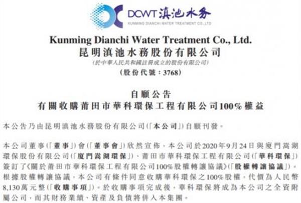 9月24日,滇池水務(wù)宣布,公司與廈門嵩湖環(huán)保股份有限公司、莆田市華科環(huán)保工程有限公司(以下簡(jiǎn)稱華科環(huán)保)簽訂協(xié)議,收購(gòu)華科環(huán)保100%股權(quán),代價(jià)為人民幣8130萬(wàn)元,交易各方已簽訂股權(quán)轉(zhuǎn)讓協(xié)議。本文轉(zhuǎn)載于網(wǎng)絡(luò),如涉及版權(quán)問(wèn)題請(qǐng)發(fā)現(xiàn)及時(shí)聯(lián)系,我們定會(huì)配合刪除;我公司專業(yè)生產(chǎn)一體化預(yù)制泵站,磁力泵,塑料泵,離心泵,排污泵,潛水泵,化工泵,油泵,隔膜泵等。