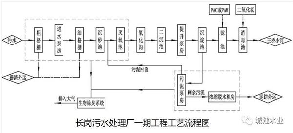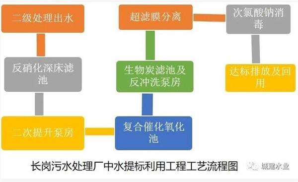 為達(dá)到環(huán)保部門要求的水質(zhì),長崗污水處理廠尾水進(jìn)行了提標(biāo)改造,具體工藝如下: