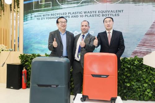 在蘇伊士展臺上,新秀麗集團大中華區(qū)總裁馬瑞國、利安德巴賽爾中國合資企業(yè)管理及聚烯烴業(yè)務(wù)副總裁付立民、蘇伊士亞洲地區(qū)固廢資源管理固廢基建及新服務(wù)業(yè)務(wù)總監(jiān)古山主持揭幕儀式,攜手推出由回收塑料制成的可持續(xù)發(fā)展系列旅行箱,展示了三方共同致力于減少碳足跡,賦予塑料廢棄物第二次生命,減少原始材料的使用的愿景。